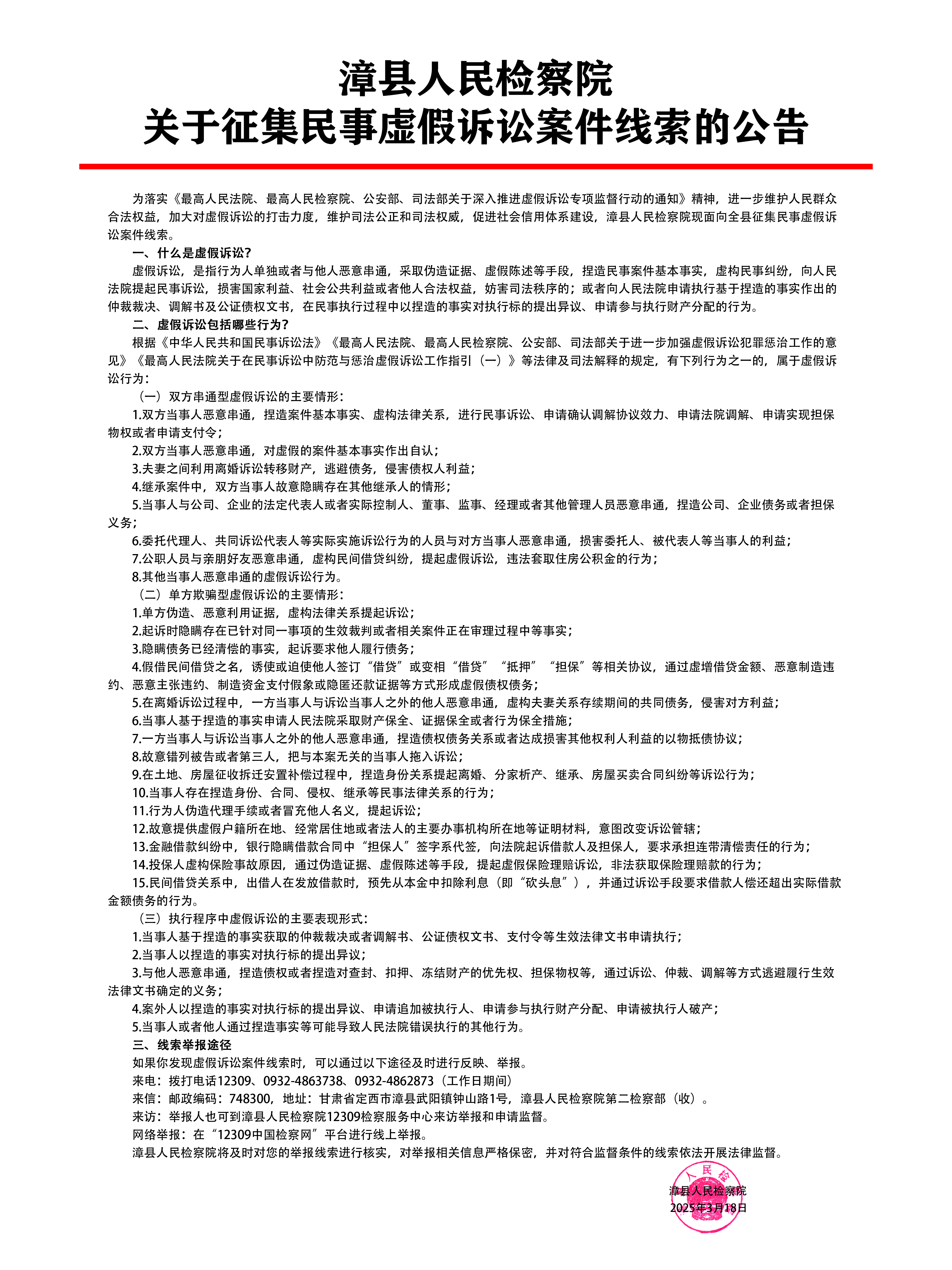• 2025-03-18|漳縣人民檢察院關于征集民事虛假訴訟案件線索的公告